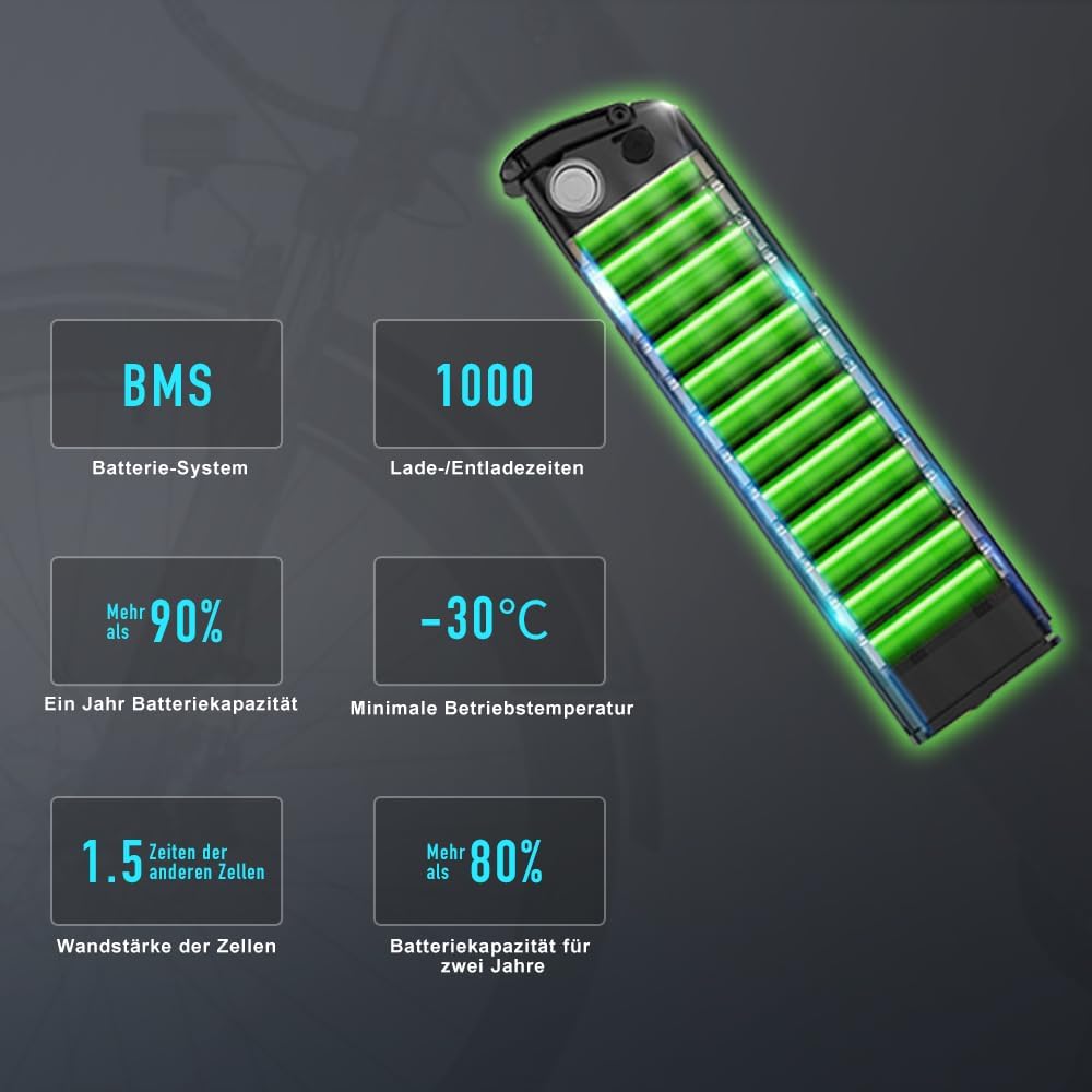 • Leistungsstarkes Energiesystem: Unser Elektrofahrrad verwendet ein bĂĽrstenloses Antriebssystem, um die Nutzung des Motorstroms zu verbessern,Mit dem eingebauten, herausnehmbaren 13Ah-Akku beträgt die Reichweite nach 4-5 Stunden Vollladung etwa 100 Meilen. Minimale Betriebstemperatur von -30 °C, verträgt 3000-maliges Laden und Entladen, kann die Batteriekapazität in zwei Jahren auf >80 % halten.